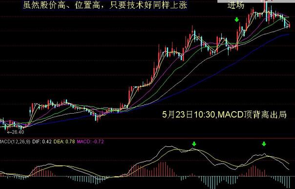 上一次博文最后还谈到我最近除了在宏达新材加仓两次外,还买了一只新股票,至于新股票是什么我没有说,我怕一些网友照猫画虎出现不必要的损失,那只新股就是中科三环,我用的就是第一次放量法介入的,这只股票由于我指导一位朋友操作,比较熟悉。 5月18日上午10点40分钟左右,在营业部里我的一位股友X女士向我咨询她的一只股票要加仓问题,我起身的她的电脑前看了图形一下说,晚了,应该在第一次放量就介入,现在过了这么多天已经到了末尾阶段,风险性较大,而后我随便打出了中科三环的图形,你看它正在要三金叉放量,现在可以进场,她看了一下说,位置这么高,股价40多元我可不敢!本来这只股票现在正在拉升高潮期,观察一下午后进场也不迟,我为了说明这种方法可行,鼓励她介入的勇气说,你不敢进场我进你看,下单在40.02元成交,然后我回到原位置坐下。过了一会她告诉我说你赚了快到一元钱了。实际到了收盘是39.26元,不赚反套,介入早了。该股在5月23日10:30分钟,60分钟的MACD走顶背离时出局,每股赚4元多钱,由于当时我买给X女士看的,没有买多少。