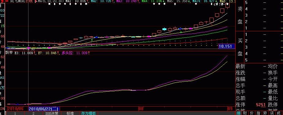 三是:股价沿5日线飙升。强势股运行都沿着5日线不断的飙升,稍弱的沿10日线运行。均线系统是最用的系统,它可以直接判断股票运行的强弱。大家可以去找找任何一只大幅拉升的股票,可以发现股价一定会沿着5日线不断的上涨,量能持续放大(大量后缩量更好),如果有打到5日线10线下,也会在一天两天马上复位继续上涨(一般收盘不破25日均线),不然就不是强势股了。如果说我们持有的股票,均线波动混乱,那就不可能是强势股。