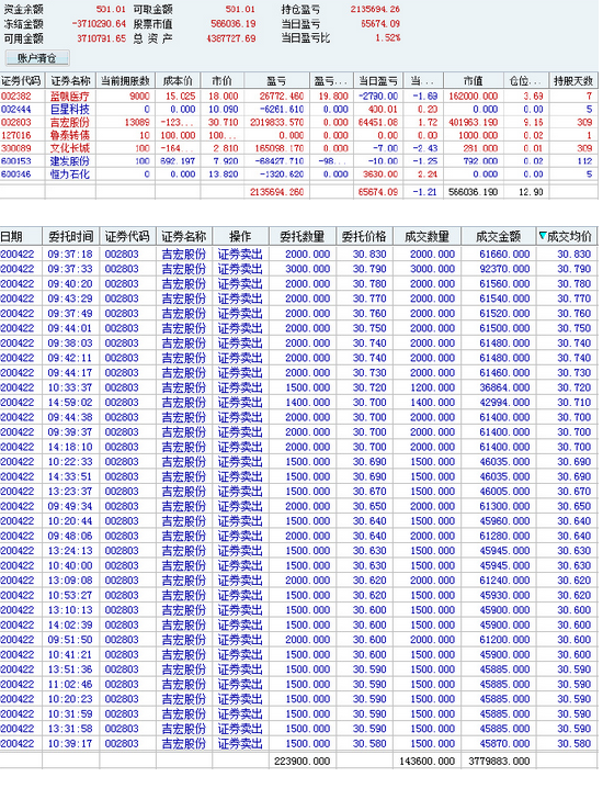 从4月份开始,我的操作节奏错乱了,跌时重仓,涨时轻仓,跑输大盘。今天如果无反弹,下跌中我也将被迫减仓,损失将扩大。还好反弹了,涨幅不足以弥补昨日损失,但减少损失就是好事。中证A股刚好涨回前天位置,吉宏还差0.4元,我也差4万。