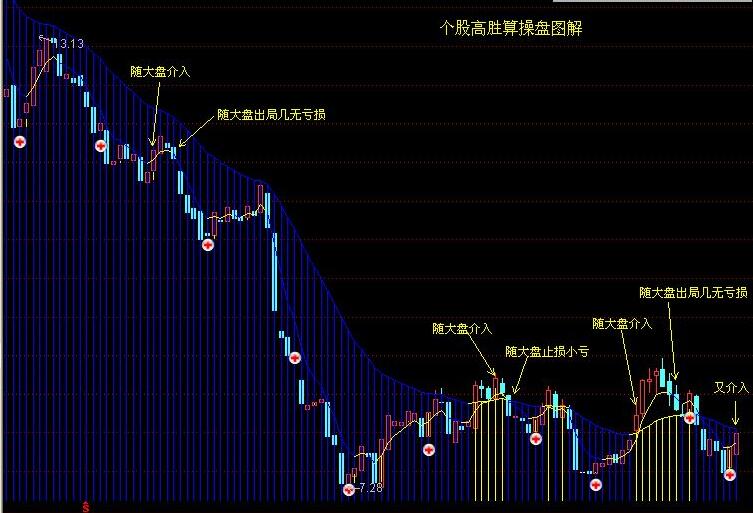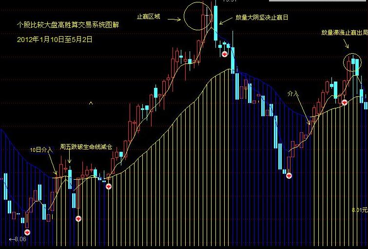 操盘说明:主图的蓝色柱为空仓区域风险大于机会。黄色柱出现即市场转强信号,为谨慎介入或持股做多区域,机会大于风险。再结合参照成交量操盘则更为理想。依照此系统操盘在黄色多方柱出现时及时介入但要设好止损位。尤其是介入周的周五如果缩量收于5日均线下,或周五出现大阴线则无论盈亏必须先出局。等下周重新出现黄色多方柱再次介入,可以避免趋势重新向下带来的风险。如果严格遵循本技术指标交易,则今年年初至5月9日的两个波段上涨行情大赚无疑。