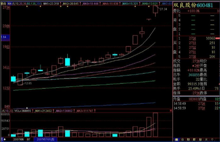 从实战的角度来说,用中期均线组合分析研究大盘或个股的行情趋势比短期均线组合准确可靠得多。比如,当大盘见底回升时,如果你对向上反弹还是向下反转没有十足的把握,那么这时观察中期均线组合,就会给你带来很大帮助:一般来说当5日均线、10日均线上穿20日均线、30日均线时,会出现一次比较可靠的中级行情,当中期均线黏合向上发散往往预示着大行情的来临。