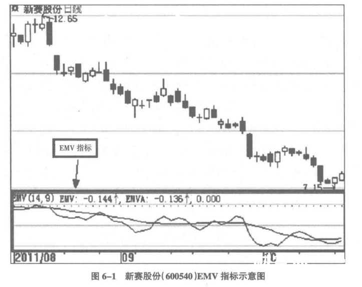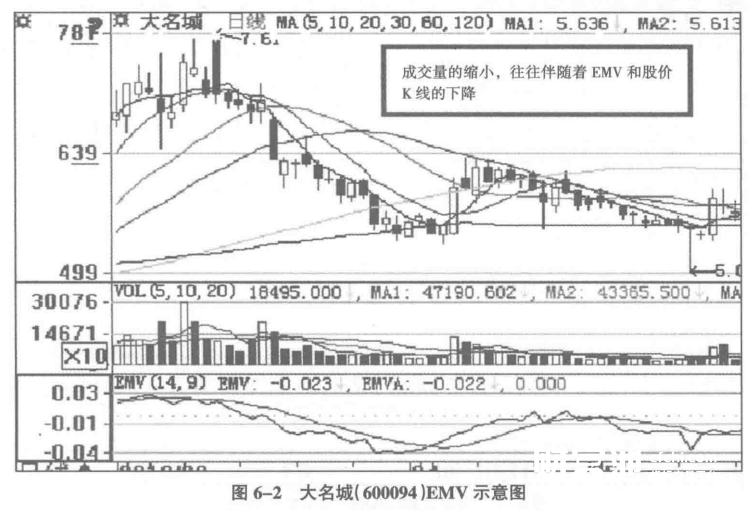 目前国内大多数股票分析软件都可以进行EMV指标的查看和操作。图6-1就是大智慧软件中的EMV指标。