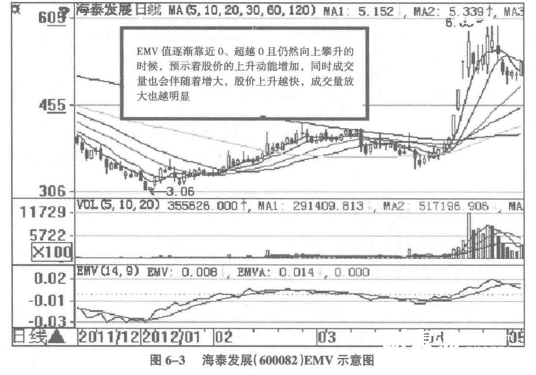 第一,在成交量较少时就能使股价上涨,EMV值上升。例如,图6-3中的成交量情形,很多投资者也许会纳闷,为什么股价上涨,EMV上升,但是成交量却一直没有很明显地放大?其实就是这个原因。在股价上涨的时候,EMV 的同步增长其实只是对这种趋势的确定,而成交量是真实成交状态的反应,轻微放大也是—种放大,不影响EMV值的上升。