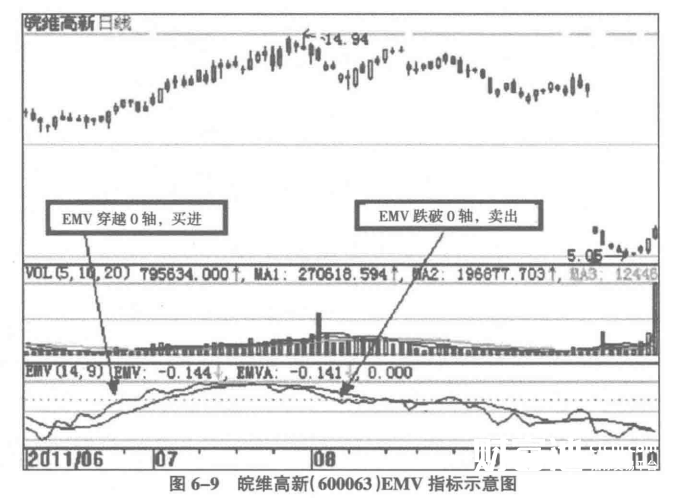 总结起来,EMV的应用法则很简单,基本上可以归结为:EMV自下往上穿越0轴,买进;EMV自上往下穿越0轴,卖出。图6-9就是利用EMV简易判断买卖信号的案例。