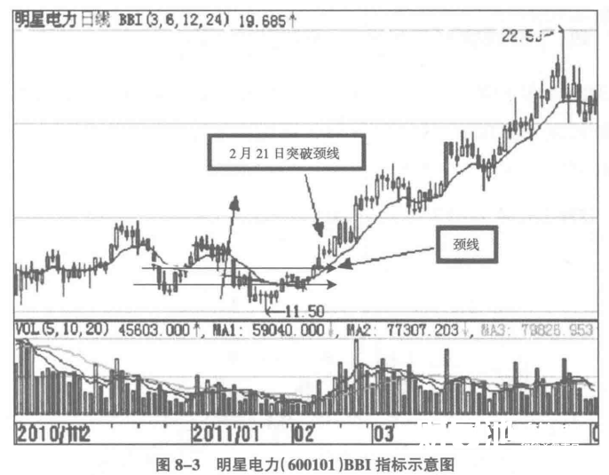 明星电力(600101)于2010年12月29日和2011年1月25日出现了两次低点(如图8-3所示),我们将这两个低点相连,再沿着两个低点中间的高点画出一条水平线,与BBI指标相交的两个K线就是个股的颈线。对于明星电力(600101)来说,2011年2月21日就是一个突破颈线的股价,可以买入。