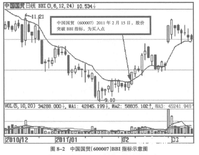 如图8-2中国国贸(600007) BBI指标示意图所示,在2011年2月15日前的将近四个月内,该股的股价一直是呈向下的趋势,BBI 始终位于股价之上。但是经过这些天的震荡、筑底,该股于2011年2月15日这天,一改走势,股价开始回升。其中最明显的特征就是BBI被股价突破,此突破日就是买入点。