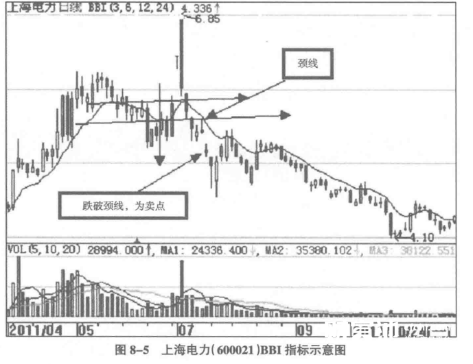 2011年5月、6月、7月,上海电力(600021)的BBI指标线在高位形成双重顶形态。8月5日,该股的BBI跌破了双重顶的颈线,此时可以作为卖点,如图8-5所示。
