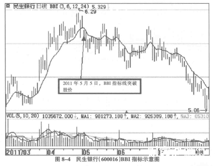 5月5日的时候,股价还没有明显回落的趋势,但是BBI 指标线却首次升高到股价之上,这说明后市上涨的空间已经不大,此处为较好的卖点之一,如图8-4所示。