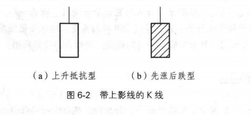 (3)阳线的上影线代表上升趋势的削弱,阴线的上影线则代表下跌趋势的增强,上影线越长,后市越被看淡,如图6-2所示。