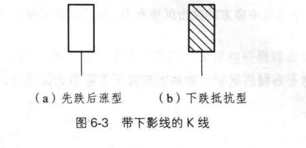 (4)阳线的下影线代表上升趋势的增强,阴线的下影线则代表下跌趋势的削弱。一般说,下影线越长,多方的反击力度越强,如图6-3所示。