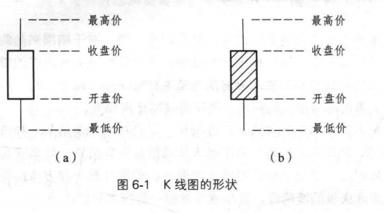 K线分为日K线、周K线、月K线和年K线几种,分别根据日资料、周资料、月资料和年资料进行绘制。个别场合下(如使用计算机)还可绘制分时K线图。K线图的形状如图6-1所示。