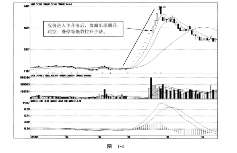 庄家在主升浪中的运作方法很多,常用的有飙升、跳空、涨停、对倒、推升.贴线、逼空、滚动八法。