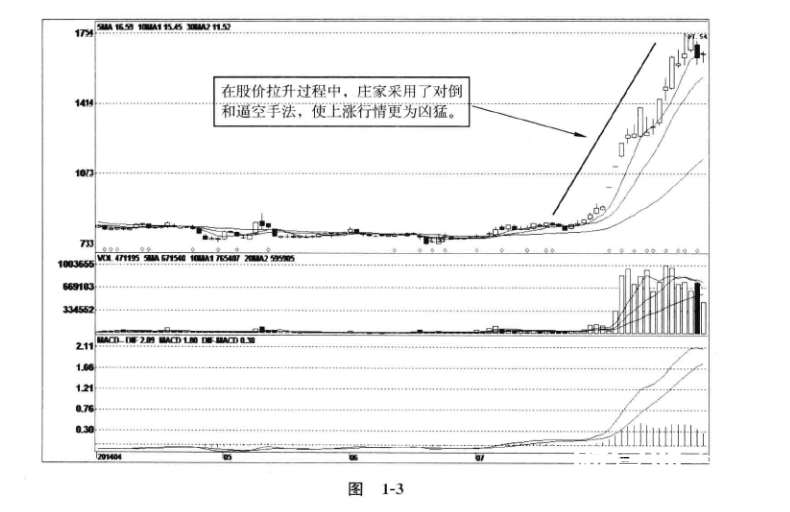 图1-3,盛屯矿业(600711):该股庄家成功完成建仓计划后,从2014年7月下旬开始顺利进入主升浪行情,庄家在拉升过程中就采用了对倒和逼空手法拉升股价﹐从而推动股价进一步走高,使行情演变得更为勐烈。