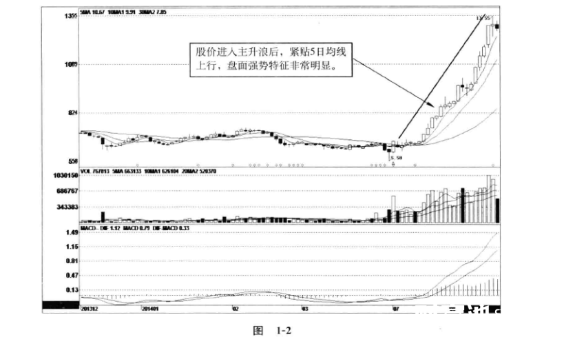 图1-2,鹏欣资源(600490):该股在2014年7月23日进入主升浪后,股价紧贴5日均线稳步上扬,盘面强势特征非常明显。
