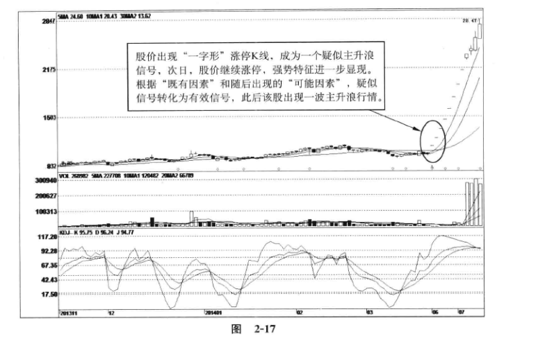 图2-17,丹甫股份(002366):2014年6月23日,股价从涨停板开盘后﹐全天封盘不动,形成”一字形”涨停K线。这根K线的既有因素:股价跳空高开,重大资产重组利好题材、股价脱离短期盘局、突破均线系统等。随后的可能因素:股价继续跳空上涨、股价突破前期高点压力位﹑盘中筹码稳固、庄家做意愿坚定等。此后,该股出现一波暴涨式主升浪行情,短线涨幅巨大。