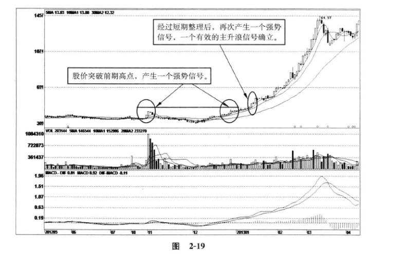 图2-19,冠豪高新(600433);2012年12月27日,一根带上影线的大阳线向上突破了前期在11月1日产生的高点,形成一个强势信号,疑似进入主升浪行情,但不能因此作出肯定