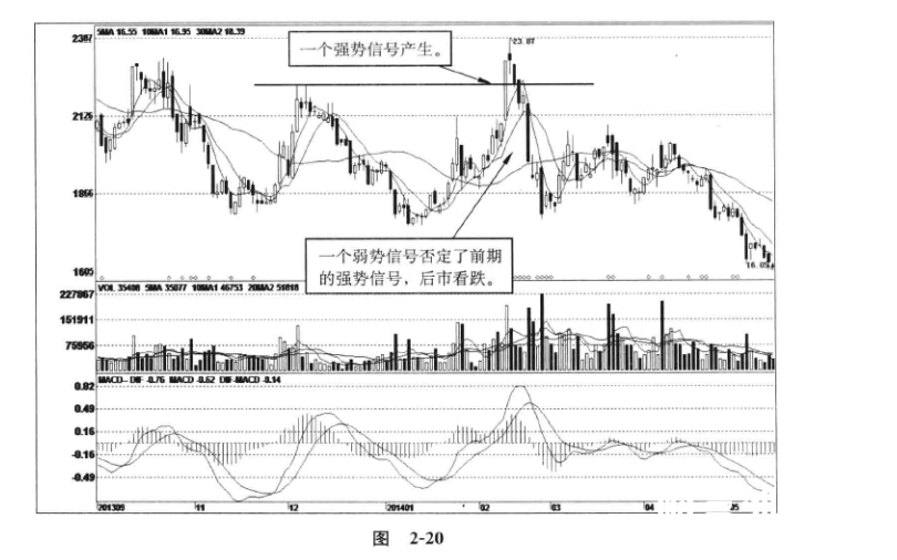 图2-20,亚厦股份(002375);2014年2月17日,股价放量涨停,一根大阳线突破了前期高点,形成一个强势信号,疑似构成主升浪信号。那么这个强势信号产生后,是否就会出现强势的上涨行情呢?当然不一定。随后在2月24日一根放量跌停大阴线,形成一个弱势信号,将前面的上涨大阳线全部吞没,使得前面的强势信号荡然无存,也就是说,后面这个弱势信号湮灭了前面的强势信号,使其无法形成一个有效的主升浪信号,而且,这个弱势信号还影响着市场的短期运行,此后股价出现继续调整走势。