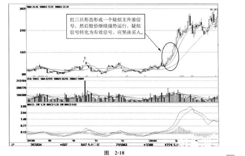 图2-18,天玑科技(300245);2014年1月21日开始出现一个红三兵形态,根据这个既有因素,形成一个疑似主升浪信号。随后股价继续强势运行,l月29日股价放量涨停,此时一个疑似主升浪信号成功转化为一个有效主升浪信号,此时应大胆买入,随后股价出现大幅拉高。