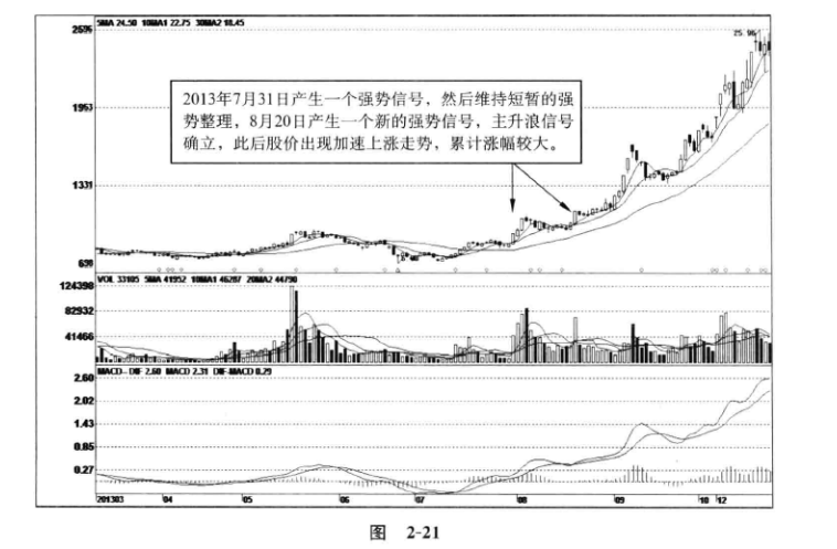图2-21 ,联建光电(300269):2013年7月31日开始,连续收出三根大阳线,突破了前面的多个高点,形成一个强势信号。但股价突破后,并没有出现持续的上涨走势,而是维持强势震荡格局,股价呈现横向窄幅波动(疑似信号维持走势)。8月20日,股价打破了这种震荡盘整格局,产生了一个新的强势信号。这个强势信号巩固了前面的强势信号,主升浪信号得以确立,此后股价出现主升浪行情。