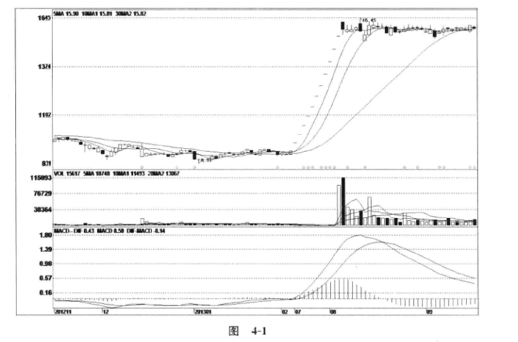 图4-1,国新能源(600617):该股在长期下跌后的底部区域,接连发布“预亏公告”“重大诉讼”等利空消息,释放了大量的做空动能,而后因资产重组停牌5个月。2013年7月15日复牌后,受资产重组利好消息影响,股价出现“井喷”式主升浪,连拉11个“一字形”涨停板。