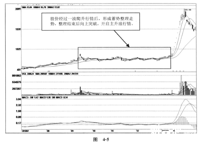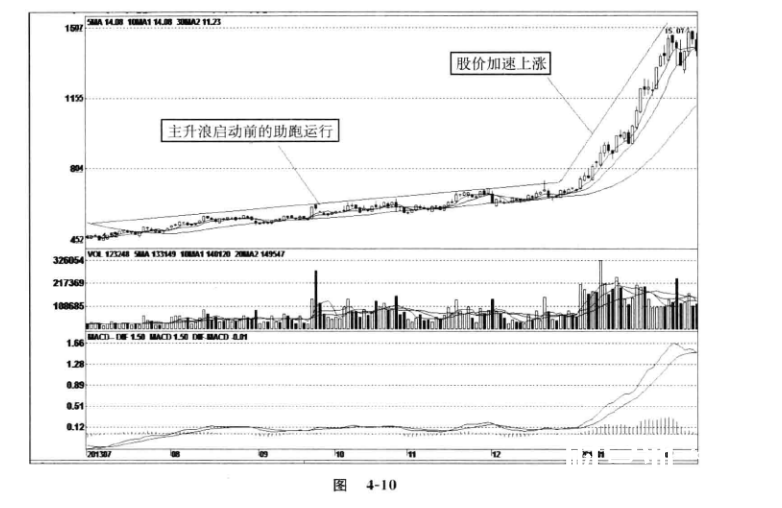 这种情况反映的内在因素为庄家缓慢吸货并推高股价,为主升浪积攒能量。这种形态可以比喻为飞机滑跑起飞,股价在跑道上经过一段时间滑行之后,开始拉高起飞,其在主升浪形态中往往力度最强。