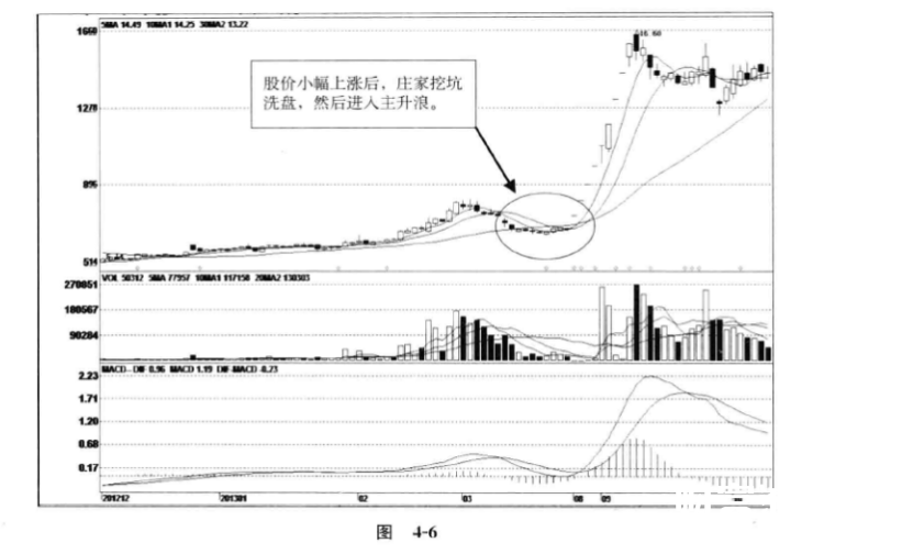 在主升浪启动前进行挖坑洗盘是庄家常用的做盘手法,目的是制造一个空头陷阱,吓退最后一批持股者,然后股价快速腾空而起,形成一波主升浪,因而有人将这个坑称之为“黄金坑”。