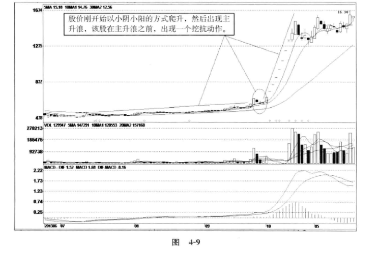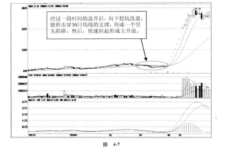 股价经过一波较长时间的缓慢上涨后,快速回落挖抗洗盘,其后展开主升浪行情。这种形态通常为前期经过一段时间的上涨或横盘,其后开始连续下跌,当跌势逐步衰竭时,用几个交易日快速下探,跌破某些技术支撑位,制造一个空头陷阱,其后强力拉起,形成主升浪。