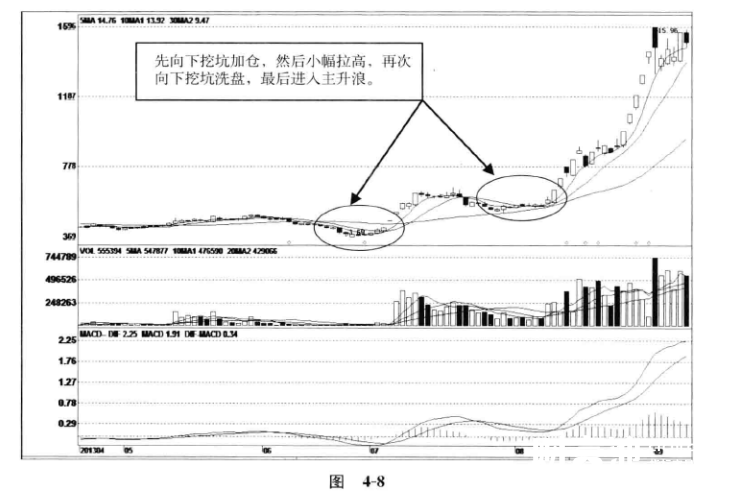 这种形态结合了上述两种挖坑走势,即先后出现两种挖坑洗盘方式。在实盘中经常出现这种情况﹐先是向下跌破技术支撑,制造一个空头陷阱,然后快速小幅拉高,形成阶段性高点,此后再次回落挖坑洗盘,最后出现主升浪。这种方式经过两次的大起大落后,个股的浮动筹码清洗比较彻底,后市往往具有较大的涨幅。