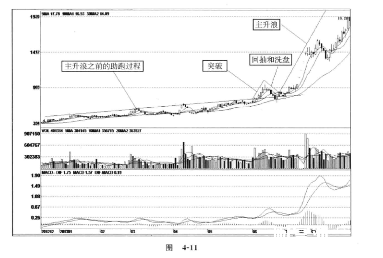 图4-11,神州泰岳(300002);该股与上述两个实例的不同之处在于,在助跑过程中出现一定幅度的震荡走势,在爬高时伴随着大阴大阳的方式逐波向上推高。但基本遵循着助跑启动方式的特征,股价突破后进行回抽确认和洗盘整理,最后进入主升浪。因此,投资者多分析多比较﹐就能发现共同的运行规律,这个共同规律就是主升浪的规律。