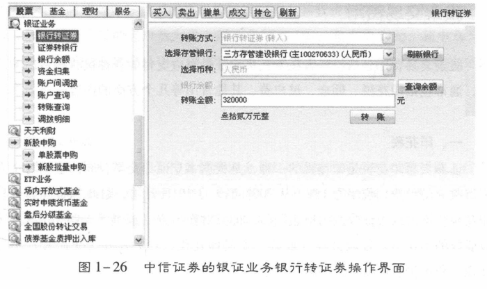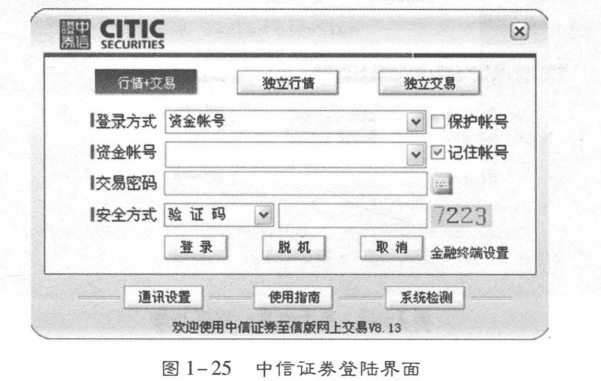 下载所属证券公司的网上交易软件(带行情分析软件)或证券公司有附送软件安装光盘在电脑安装使用。用资金账户,交易密码登陆网上交易系统,进入系统后,通过银证转账将银行的资金转入资金账户就可以买卖股票操作了。图1-25、图1-26、图1-27分别为中信证券开户者的登陆界面、银证业务界面和股票买卖界面。