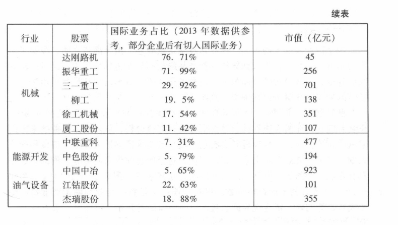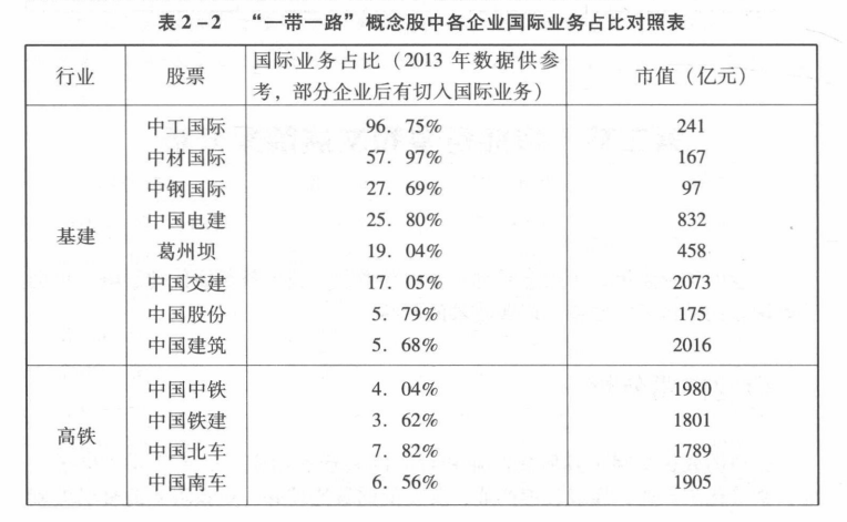 同时还必须调查分析企业商品对不同需求对象的满足程度,不同的需要对象对商品的性能、品质也有不同的要求,公司以需求定产,否则,必然影响公司的产品销售,从而影响盈利水准,使投资收益降低,股价下跌。表2-2为2014~2015年的“一带一路”概念股中各企业国际业务占比对照表。国际业务占比高的股票必然受到政策倾斜和市场追捧,股价会有好的表现。