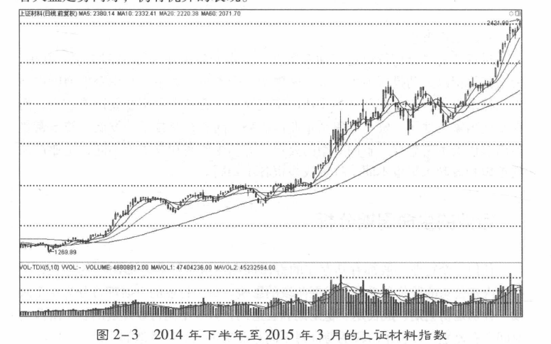 沪深指数中都有重点行业指数,反映不同行业股票的市场表现。图2-3为2014年下半年至2015年3月的上证材料指数。材料行业虽不是新兴行业和朝阳产业,但随着大盘走势向好,仍有优异的表现。