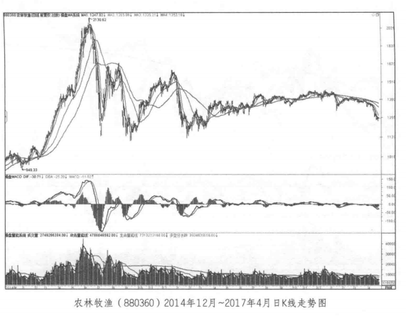 仙坛股份是一家主要从事集肉鸡饲养、加工、销售为一体的养殖类公司。2016年,随着饲料价格的下降和鸡肉价格的上涨,仙坛股份完成了两波非常强势的上涨行情,在2017年1月中央一号文件出台时股价处于历史高位。仙坛股份和北大荒的走势如出一辙,仙坛股份的上涨明显比北大荒更强势,待利润空间充分释放,最大的利好就是多空的转折点。