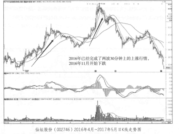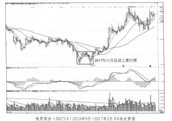 2016年12月的下跌行情中牧原股份也不能幸免,从12月9日到12月28日共14个交易日的时间下跌了9.53%,但是经过了短暂回抽后的二次下跌时深证成指创了新低,牧原股份走出了30分钟上的小双底,明显强于大盘。双底确认后,股价从各周期均线的空头状态开始起涨,3月最大涨幅达到了27%。