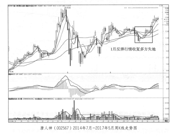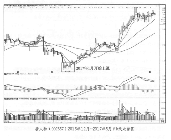 唐人神在2016年12月走出了下跌趋势,尤其在最后一个下跌波段走出了典型的快速下跌,出现大阴线,但是成交量处于缩小状态,市场的恐慌盘已经出逃完毕,是主力资金开始吸筹的绝佳位置。此时还应该关注周K线,周线上的生命线和决策线还处于金叉状态,在更大周期上还处于多头行情。