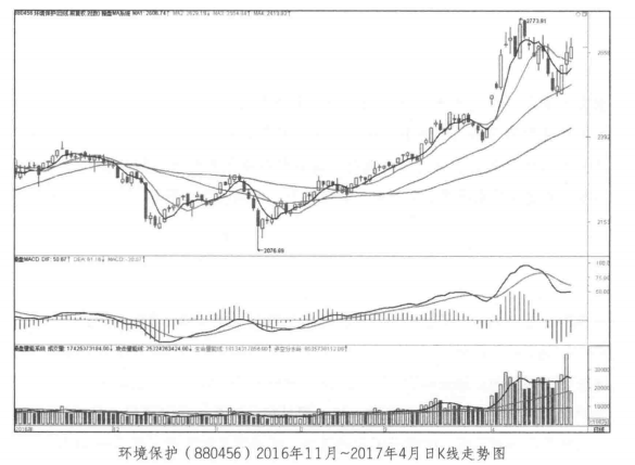 很多曾经以化工为生的企业,在政策面一次次加紧对环境保护的措施后营业收入大幅下降,没有实现顺利转型的化工企业的收入不及之前的十分之一,同时制造环保设施的企业快速崛起。下图是2017年中央一号文件发布后环境保护板块的走势图,2017年1~3月缓慢上涨,有明显资金进场的特征,在“两会”期间实现了加速上涨。