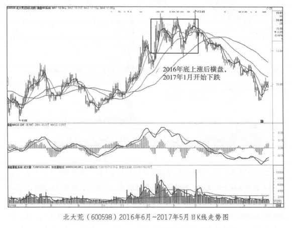 在2016年11月的上涨行情中,北大荒已经走出了一个上涨波段,在2016年12月和2017年1月展开高位横盘,最后以向下跌破盘整确认下跌趋势而告终,并没有走出在中央一号文件促动下的强势上涨。