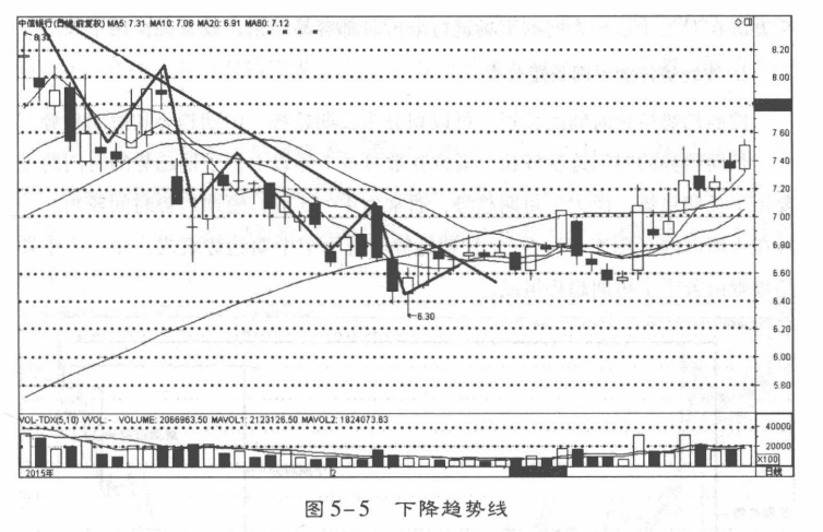 (2)下降趋势线。下降趋势线是在股价持续下跌过程中,将每次的反弹高点相连而形成的趋势线。如果股票运行过程中每个后面的峰和谷都低于前面的峰和谷,则趋势就是下降方向(图5-5)。这就是常说的一顶比一顶低或顶部降低,此时应该画出下降趋势线。