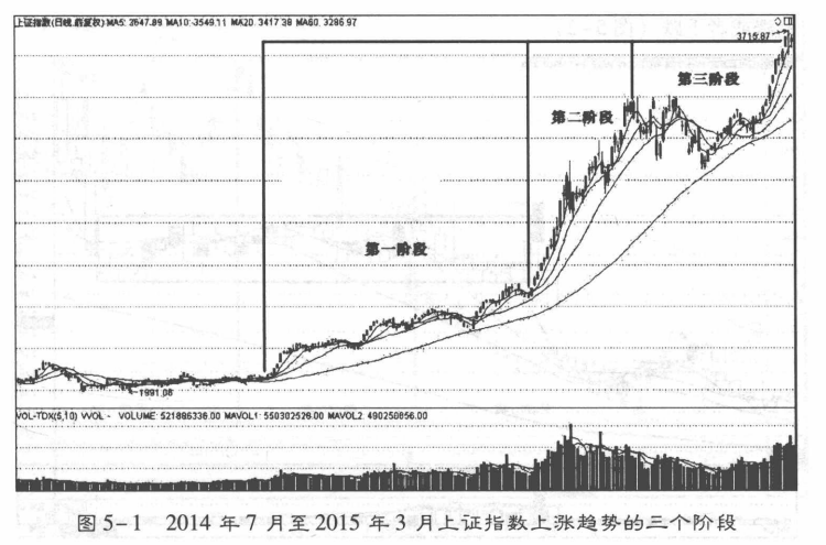 上升趋势是指股价在某一段时间内的波动中,股价的顶部在不断刷新,股价处于明显的上升趋势中。基本上升趋势,通常划分为缓慢上涨阶段、稳定上涨阶段、成交放大阶段三个阶段(图5-1)。