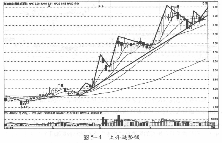 (1)上升趋势线。上升趋势线是在股价持续上涨过程中,将每次的调整低点相连而形成的趋势线(图5-4)。如果股票运行过程中每个后面的峰和谷都高于前面的峰和谷,则趋势就是上升方向。这就是常说的一底比一底高,或底部抬高,此时应该画出上升趋势线。
