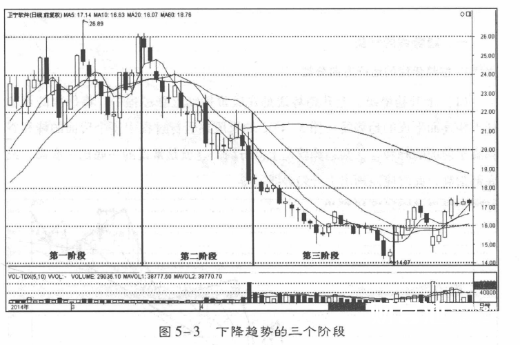下跌趋势,通常也划分为行情转弱阶段、恐慌抛盘阶段、持续看跌阶段三个阶段(图5-3 )。