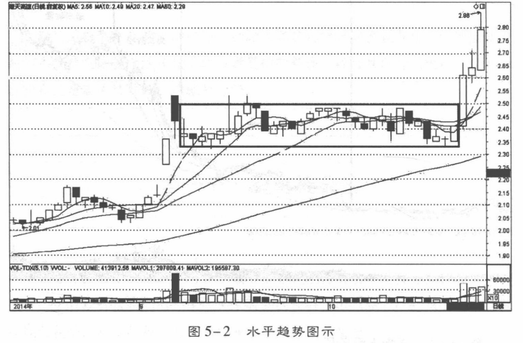 水平趋势是指股价在某一段时间内的波动中,股价波动较小,没有剧烈的上涨或者下跌(图5-2)。