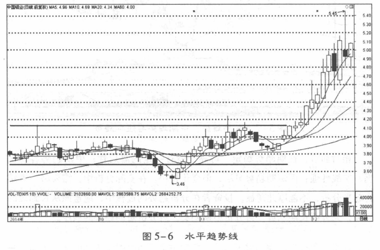 (3)水平趋势线。水平趋势线是在股价持续横盘整理过程中,将每次的低点或高点相连而形成的横向延伸线,没有明显的上升和下降趋势。如果价格图形中后面的峰和谷与前面的峰和谷相比,没有明显的高低之分,几乎呈水平延伸,这时的趋势就是水平方向,此时应该画出水平趋势线(图5-6)。