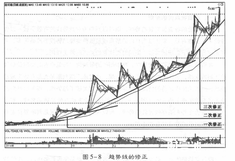 (2)画趋势线时应尽量画出不同的试验线,待股价变动一段时间后,保留经过验证能够准确反映波动趋势,具有分析意义的趋势线。另外,趋势线也不是一成不变的,随着股价走势的变化,趋势线也要不断地进行修正,才具有指导意义(图5-8)。
