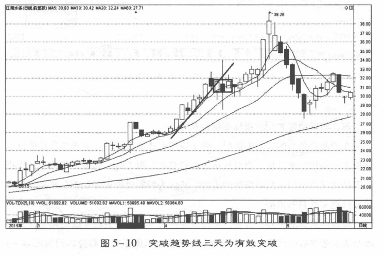 股价突趋势线后,必须要经过时间的验证,标准是突破趋势线后,连续站稳三天(图5-10)。突破趋势线以后,在趋势线的另一方停留的时间越长,突破越有效力。