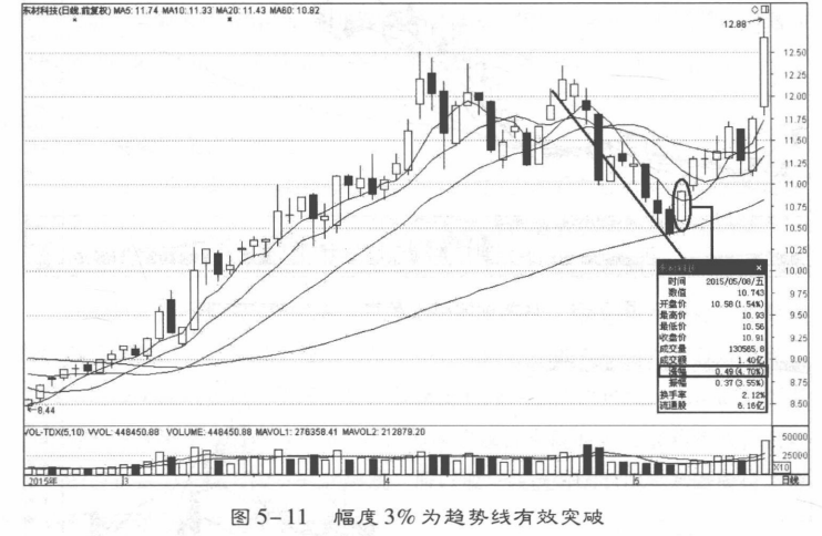 即突破后,距离趋势线越远,则标志着突破越有效。收盘价突破趋势线的幅度要达到3%,只有达到这一标准,才算突破有效,其他现象有可能是假突破(图5-11)!当然也要对K线的实体和换手率的大小进行考量。
