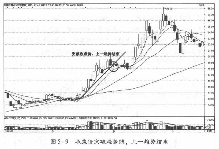 在股价运行到趋势线附近时,技术图线的最高价、最低价有时突破趋势线的压制或支撑,运动到趋势线的另外一端,这时还不能判断是否是有效突破趋势线,应该关注收盘价的情况:如果收盘价有效突破了趋势线,则可以判断股价走势有效突破了趋势线(图5-9);