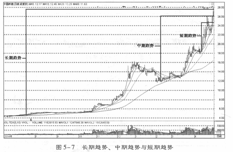 按照趋势持续时间的长短,可以划分为长期趋势、中期趋势和短期趋势。长期趋势的时间跨度较长,通常在数月或1年以上;中期趋势的时间跨度要短于长期趋势,而大于短期趋势,通常为4~13周;短期趋势时间较短,一般在4周以内(图5-7)。一个长期趋势由若干个中期趋势组成,而一个中期趋势则由若干个短期趋势组成。