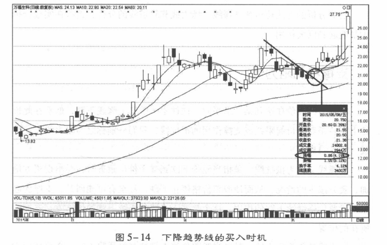 在一波下降趋势中,通常趋势线会持续一段时间,而且中途反弹也会受到下降趋势线的压制。但如果下跌趋势持续较长时间后,在相对低位时股价有效突破下降趋势线(三个交易日在趋势线之上,涨幅在3%以上)时,表明下降趋势发生逆转,下降趋势线转而成为支撑股价上涨的力量,此时,投资者可以在确认是有效突破时介入(图5-14)。