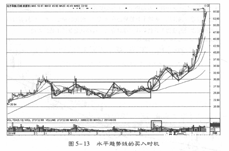 在实战操作中,当股价有效突破水平趋势线时,表明盘整格局被打破,当股价选择向上后,可能出现回调确认趋势线,也可能不会回调就直接上涨。当出现回调确认时,投资者就可以进行加仓操作(图5-13)。从盘面来看,突破趋势线往往是放量,这表明多方进场意愿强烈,总之,突破水平趋势线表明一波升势即将开始,投资者可以积极参与。
